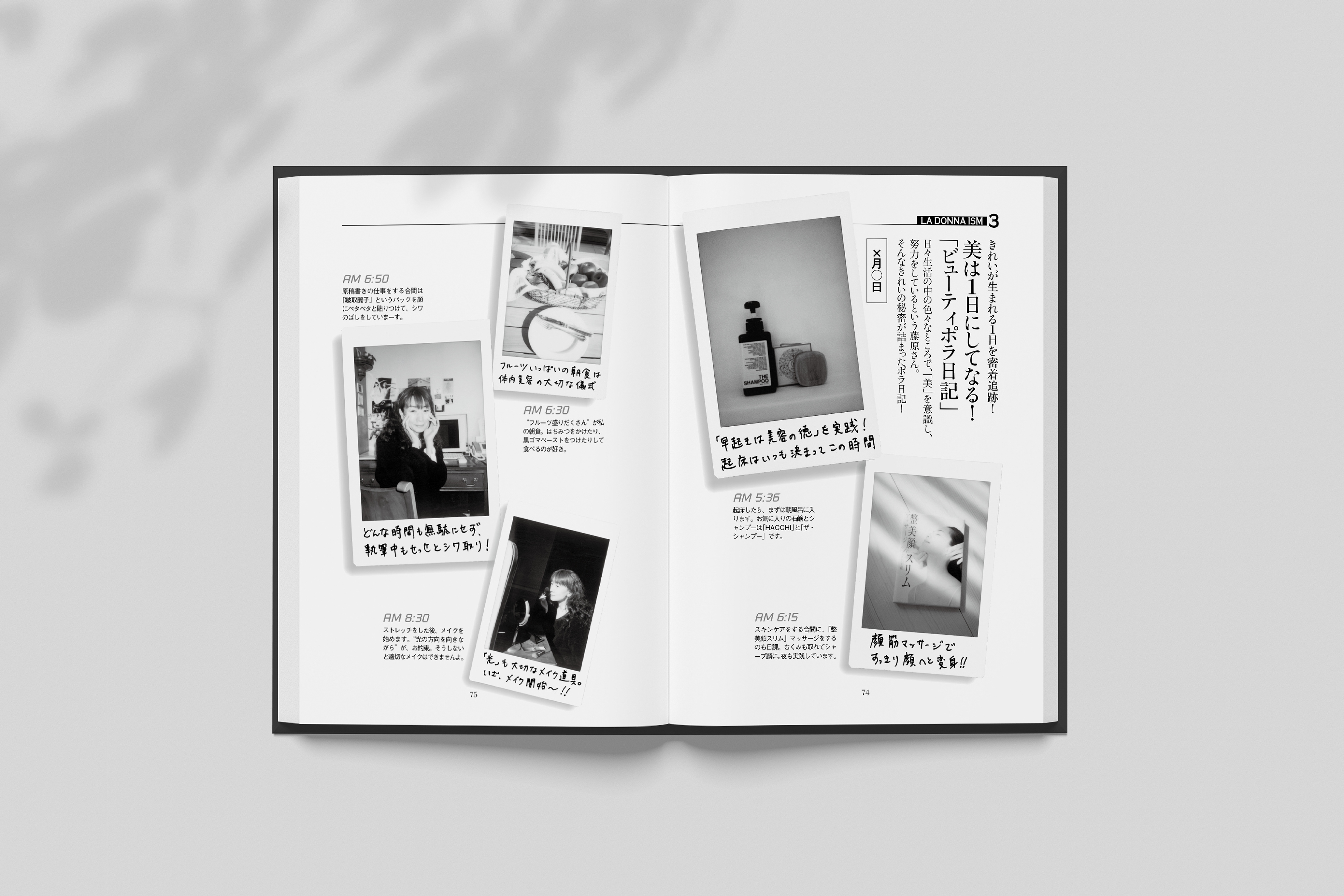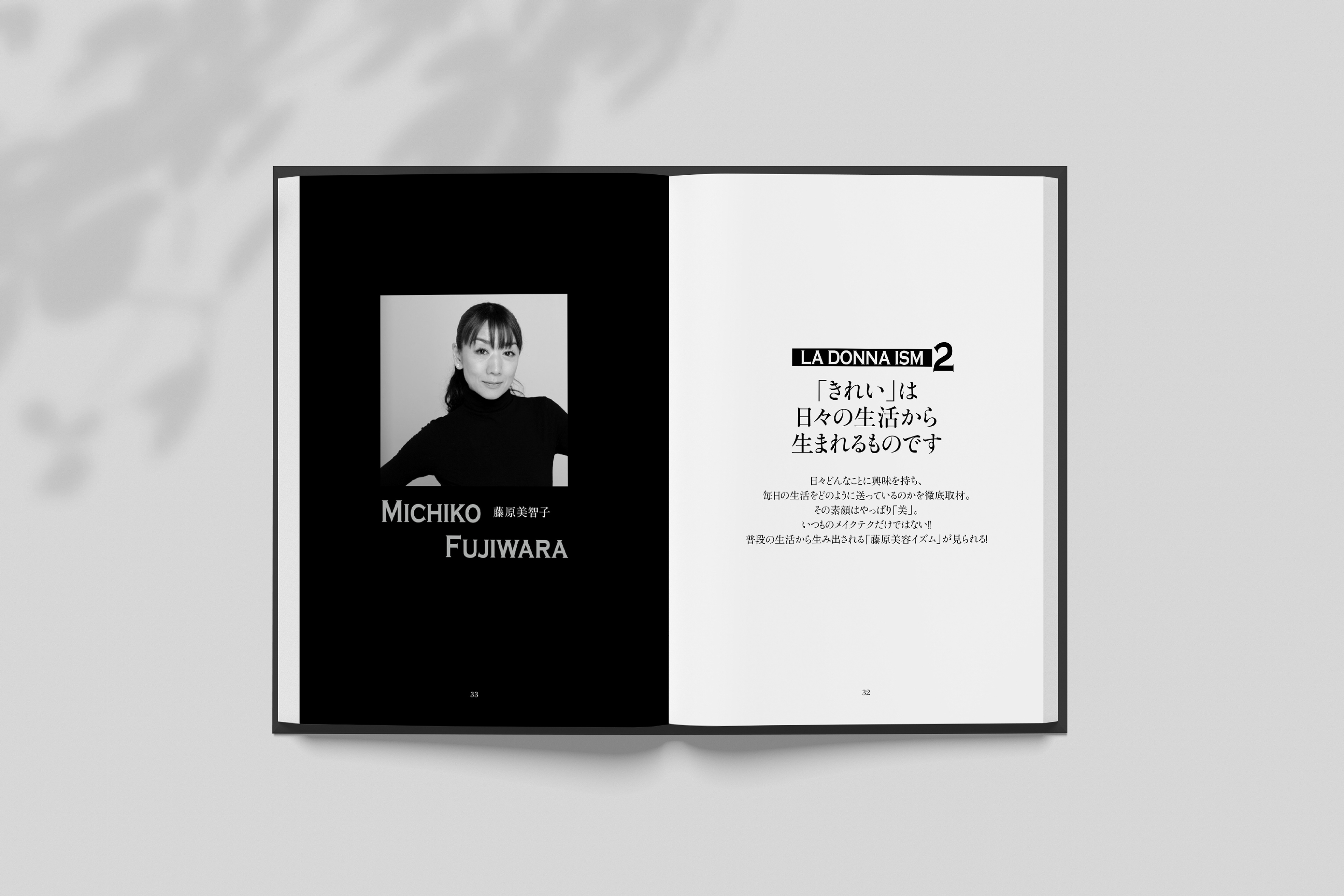 中ページを担当。ヘアメイクアップアーティストの藤原美智子さん、千吉良恵子さん、加藤雄介さんのエッセイが綴られたハードカバー本。巻頭のカラーページでは、ブラックとレッドを基調にスタイリッシュでクールなイメージに。