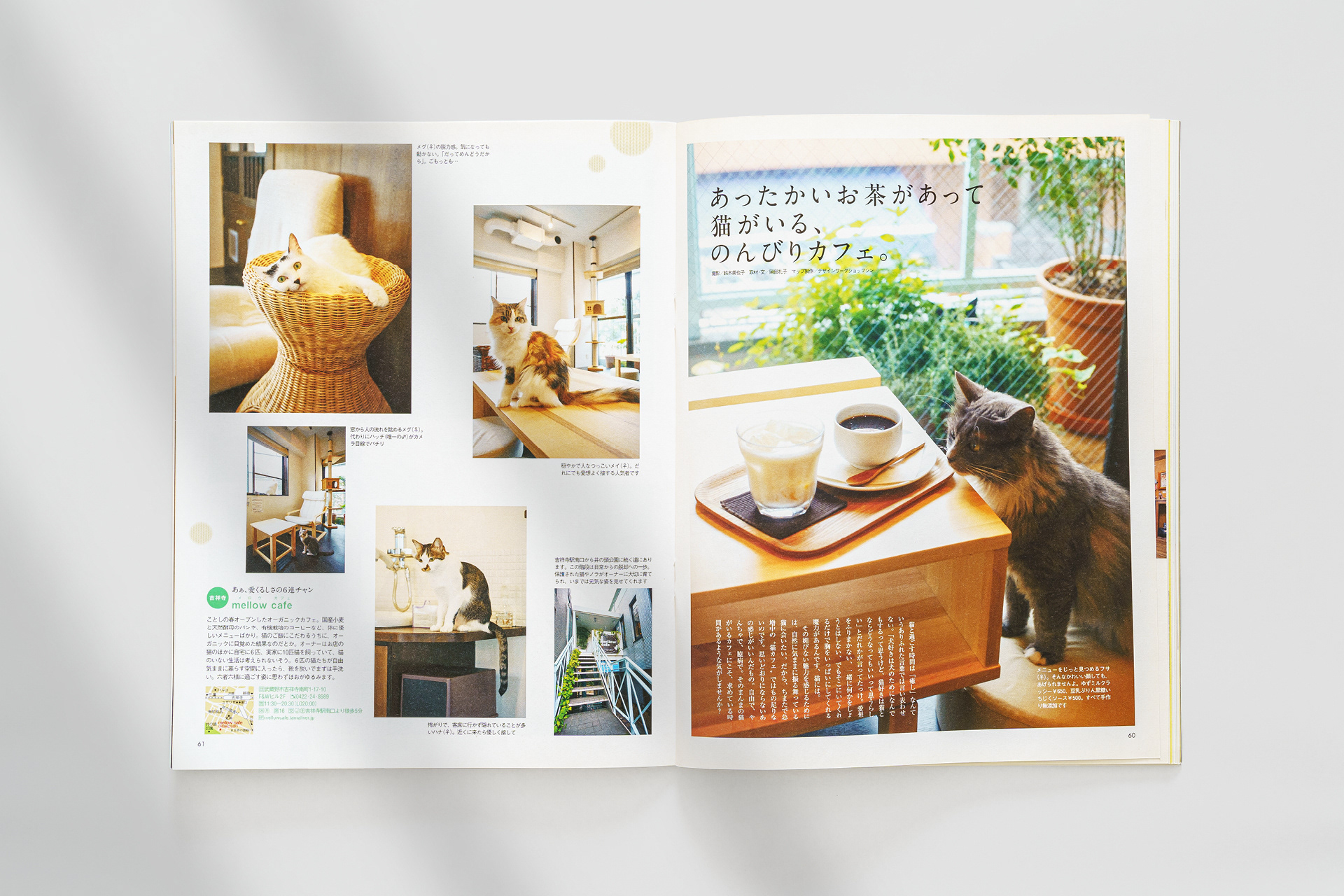猫特集では猫のようにぬくもりを感じる飾りをあしらい、ほっこり感を表現。写真の置き方に大小のメリハリと動きをつけ、楽しそうな雰囲気に仕上げました。看板猫の写真を大きくレイアウトすることで、猫を身近に感じられ、今すぐに会いに行きたくなるように意識してデザインしました。