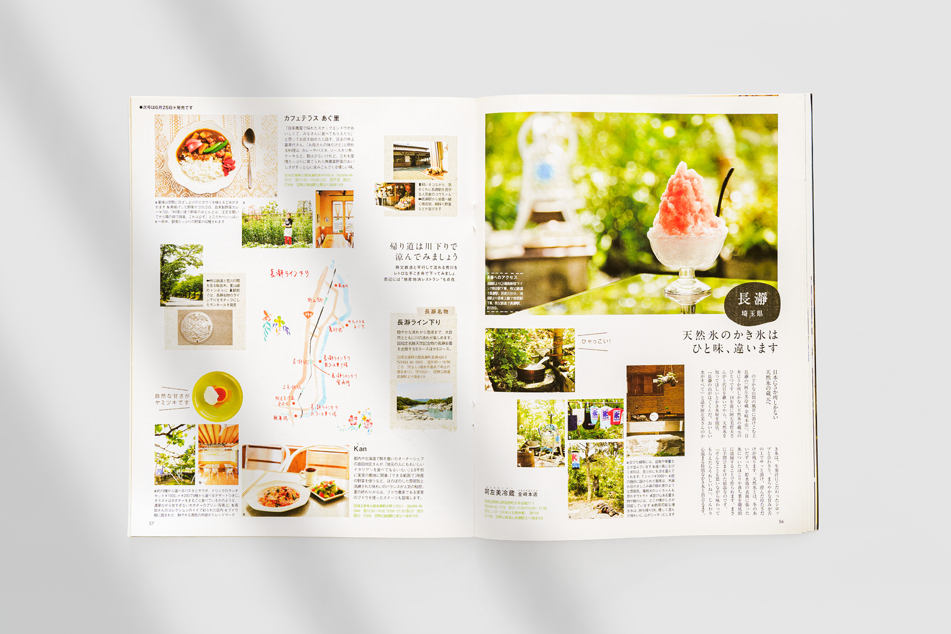 30代の働く女性をターゲットにした情報誌、ChouChouの手ぶら日帰り旅の特集。都心からアクセスしやすい目的地なので、身近で親しみのあるほっこりと落ち着くイメージでデザインしました。写真点数やテキストが多くても、余裕があってごちゃついた印象にならないよう適度に余白スペースを空けて工夫しています。