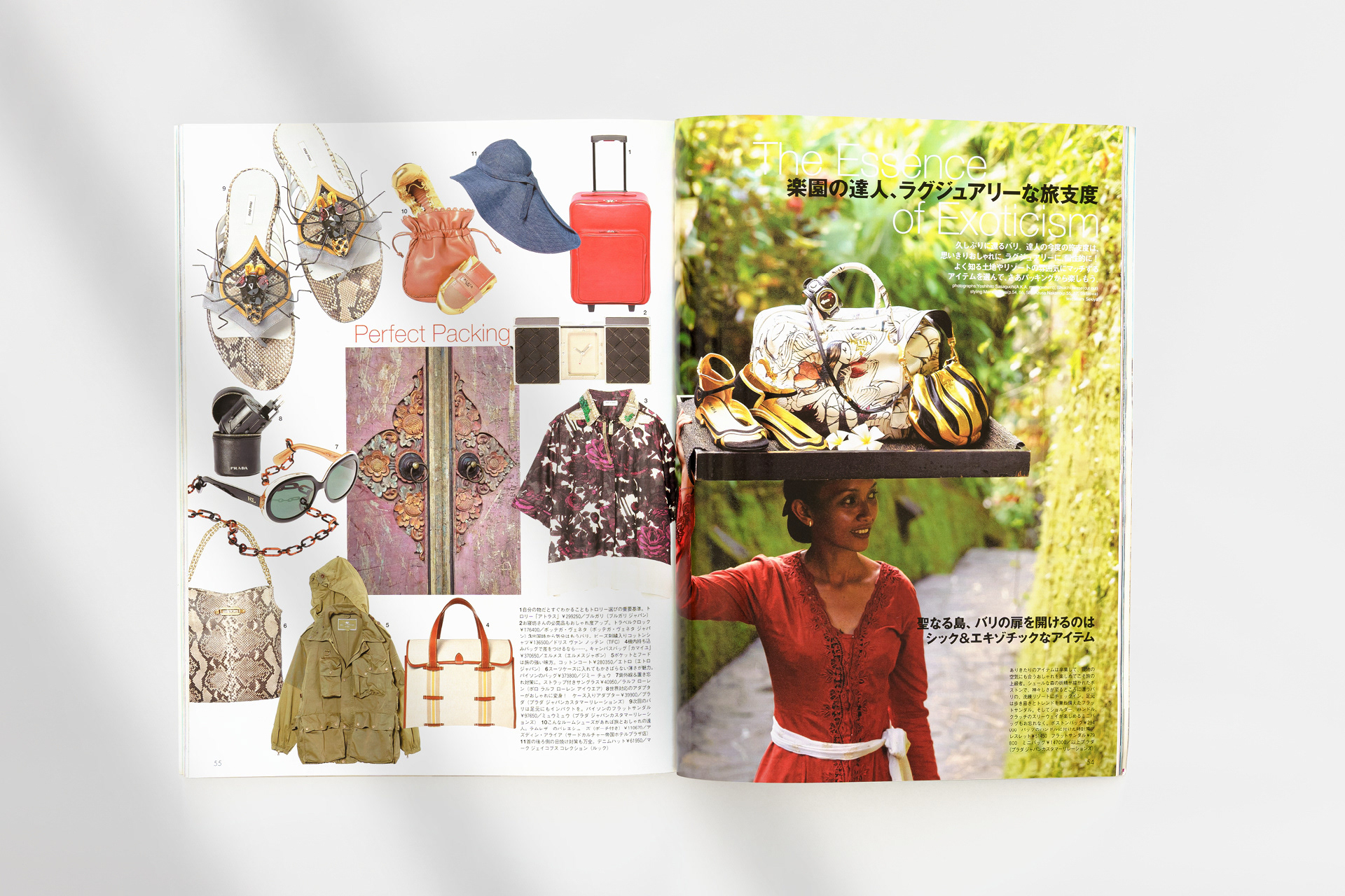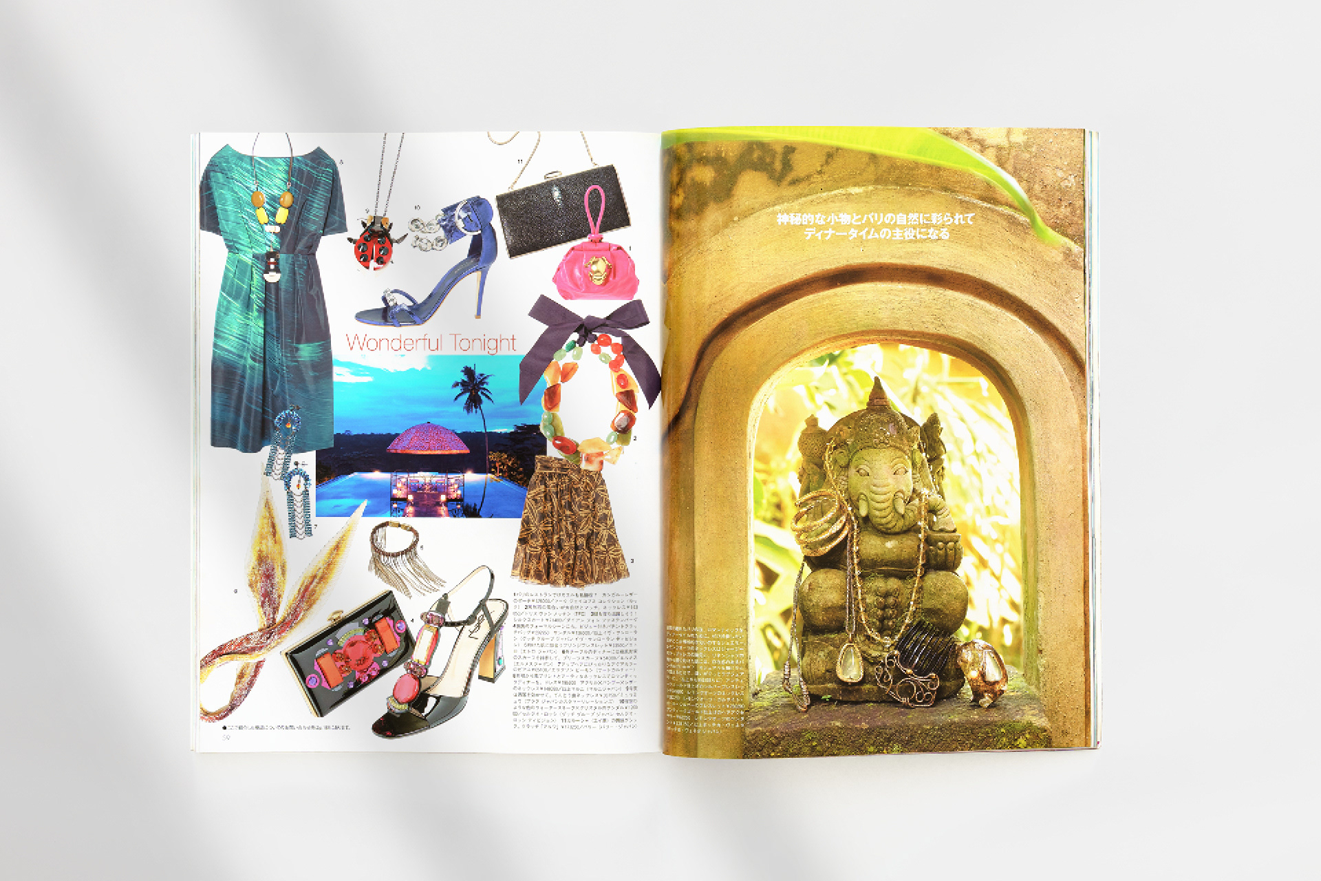 バリ旅行のお供に連れて行きたいハイブランドの個性豊かなファッションアイテムをシーン別に紹介。切り抜き写真を大きく扱い迫力を出し、その個性を引き立たせています。オーガニックやマクロビ料理を扱うグルメ特集では、パステルグリーンをベースにヘルシーさを表現。写真に大小のメリハリをつけ、リズム感あるレイアウトに仕上げています。