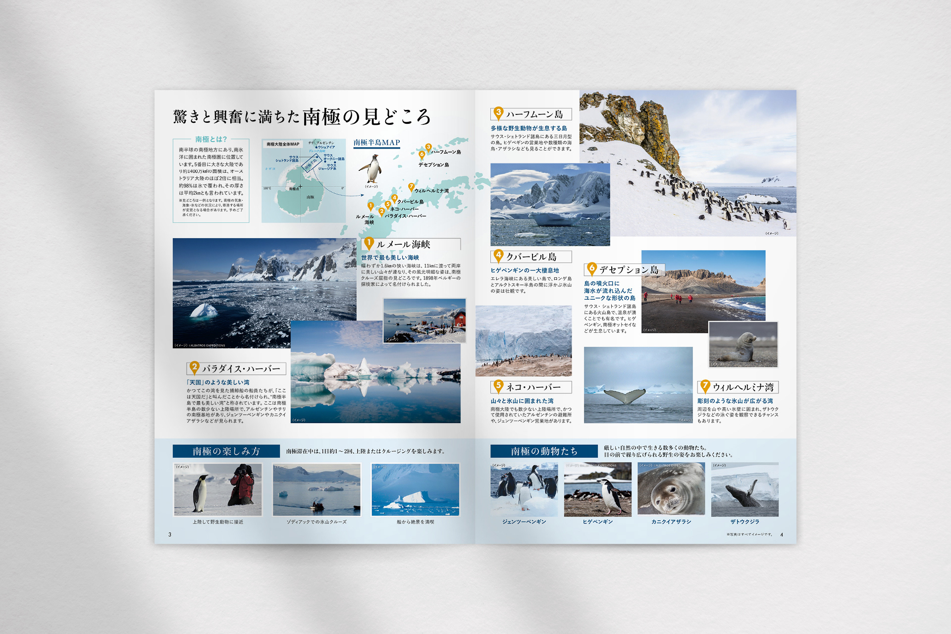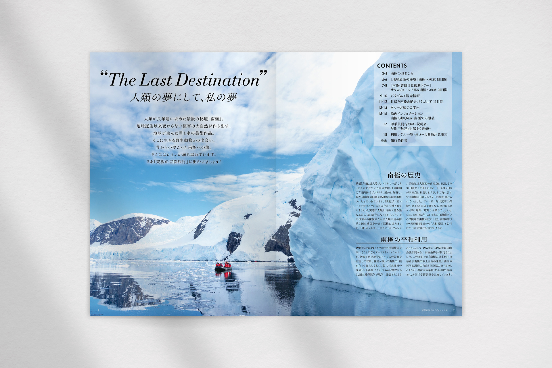 旅好きの最終目的地「南極」のパンフレット。他パンフレットと比べて最低限の情報に減らし、極めてシンプルなデザインに仕上げた表紙デザインはメッセージ性をもたせました。中ページも海峡や氷山、野生動物などの写真を大きくレイアウトし、冒険心がくすぐられるようなダイナミックな誌面に仕上げています。