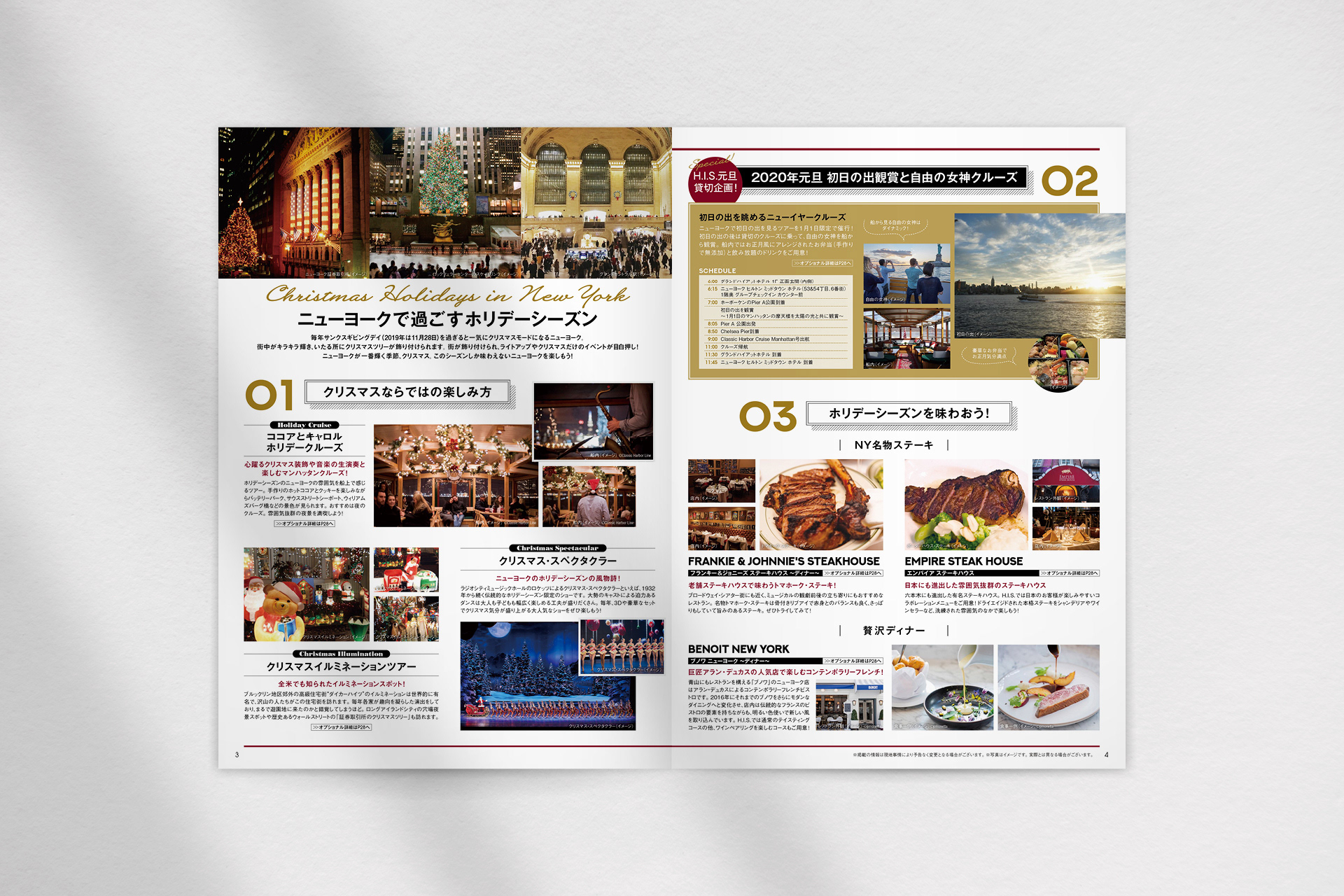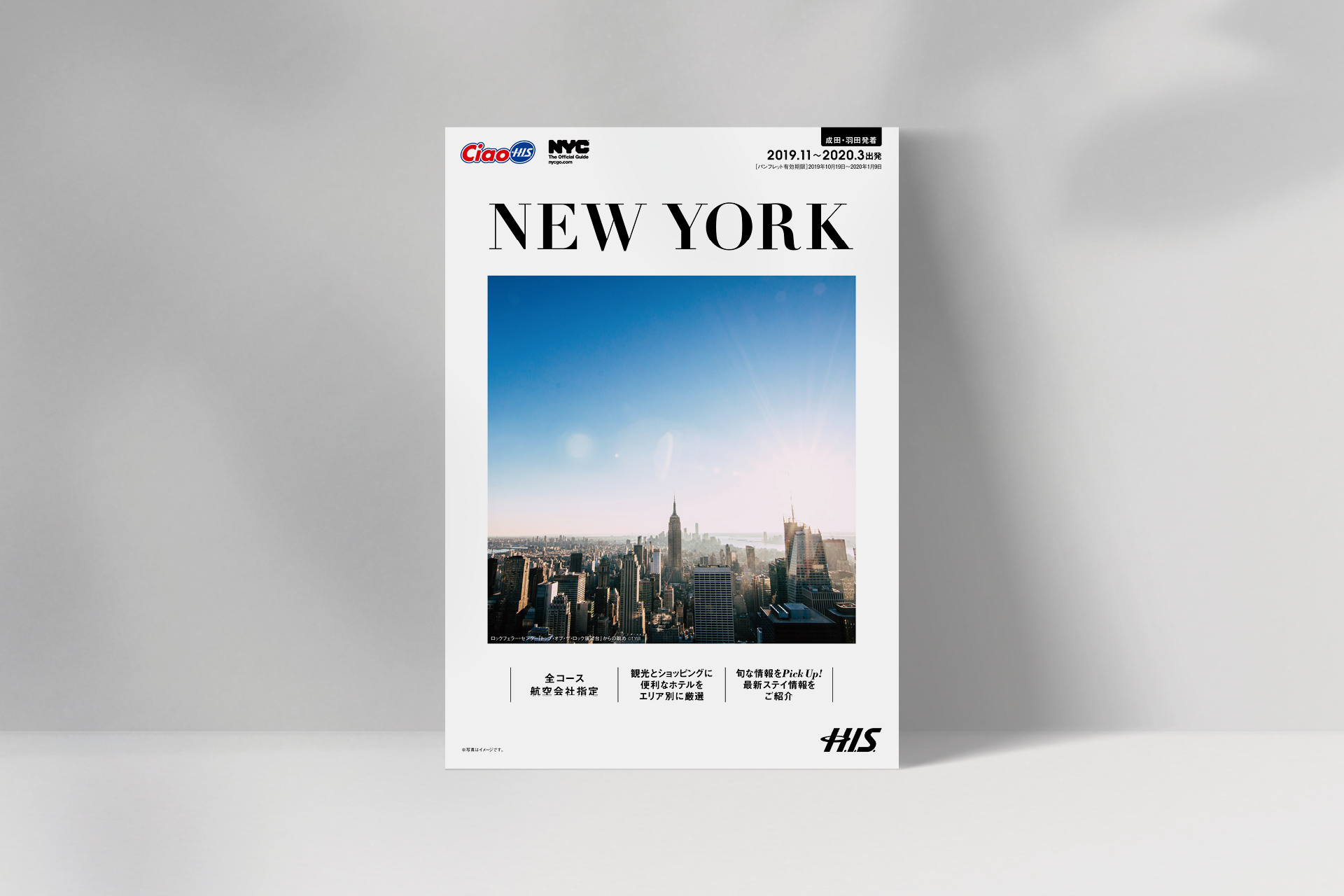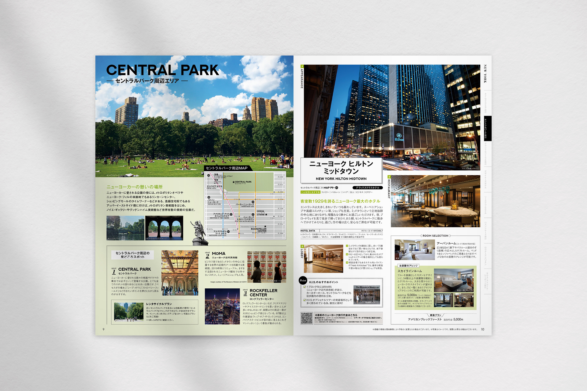 旅行パンフレットでは珍しく料金表をQRコードで表示させる、若者向けのパンフレット。料金表のスペースがない分、旅行雑誌のようにページ全体を使ってトレンドホテルを紹介。ニューヨークらしく都会的でシンプルなデザインに。欧文を立たせてスタイリッシュなイメージに仕上げました。