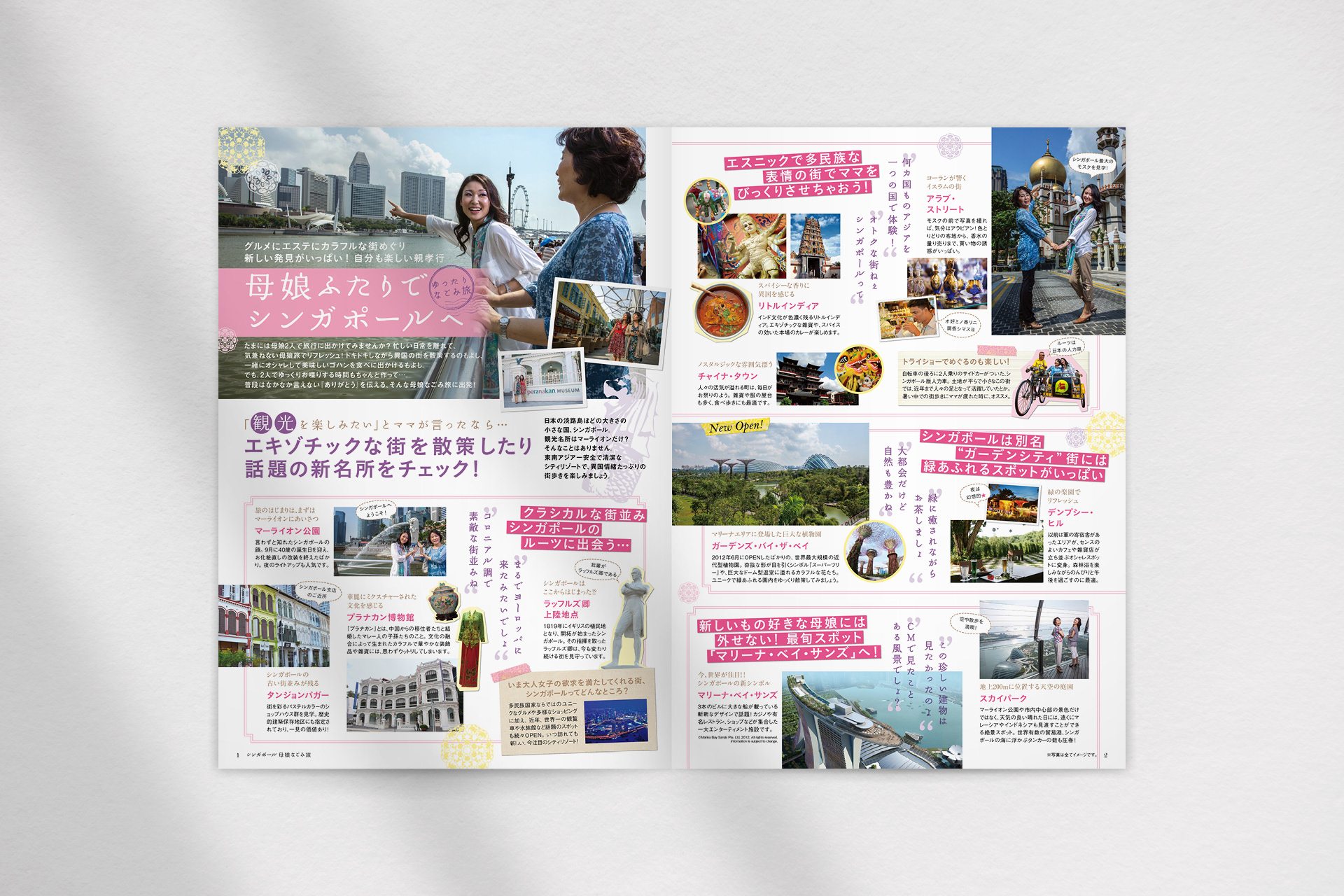 「母娘ふたりで楽しむシンガポール旅行」がコンセプトのパンフレット。ページの所々に花の様なシンガポールの紋様をあしらい、大人可愛いカジュアルなイメージに。ページ全体に動きをつけ、楽しそうな雰囲気に仕上げました。